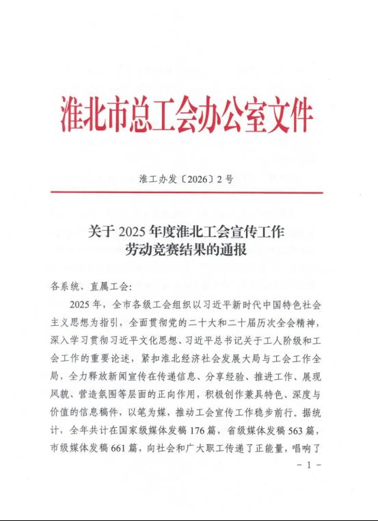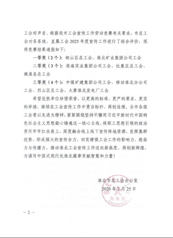 3月3日上午,淮北市总工会十三届五次全委(扩大)会议召开。会上通报了2025年度淮北工会宣传工作劳动竞赛结果,淮海实业集团工会获二等奖。