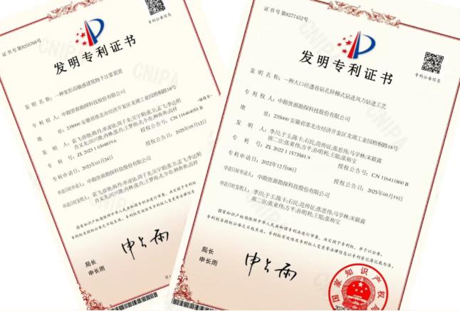 日前,中勘科技自主研发的《一种变形高敏感建筑物下注浆装置》和《一种大口径透巷钻孔阶梯式钻进风力钻进工艺》两项创新成果,正式获得国家发明专利授权。这是公司坚持“科技引领发展”战略、持续深耕技术研发取得的又一重要突破,标志着相关科技成果已成功实现向现实生产力的有效转化。