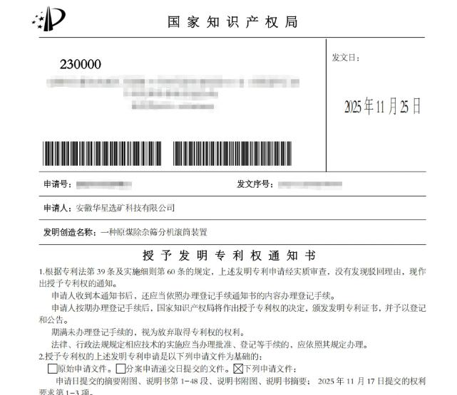 日前,华星公司自主研发的“一种原煤除杂筛分机滚筒装置”正式获得国家发明专利授权。这不仅是一项技术突破,更为该公司“十五五”发展筑牢创新基石。