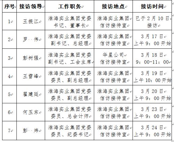 根据工作安排,现就淮海实业集团党委领导班子成员2026年一季度接待职工群众来访安排公示如下: